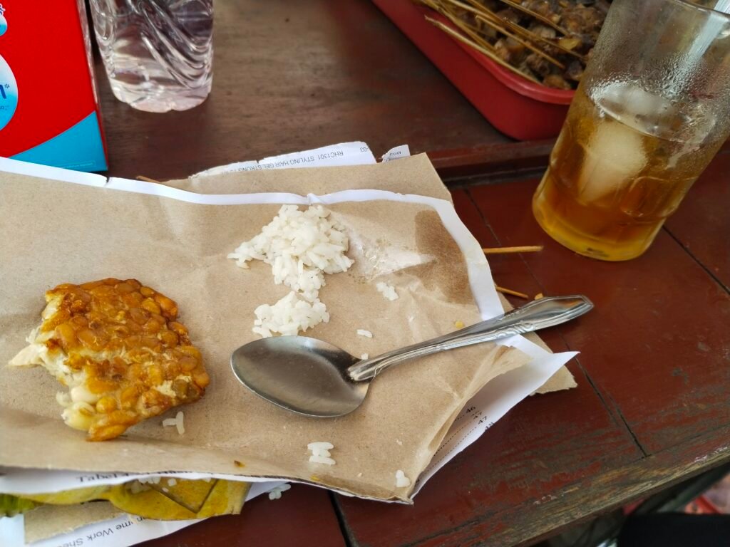 tapi karena mejanya penuh saya duduk di gerobak angkringannya. sambil makan nasi kucing dan nyerutup es teh manis saya ngobrol-ngobrol sama si bapak penjualnya. orangnya suka bercanda, “niki sekul e nopo pak? (ini nasinya apa pak?)” tanya saya karena di angkringan ada nasi oseng tempe, nasi sambel teri, nasi bihun dll. eh jawabannya malah “niku sekule beras (itu nasinya beras)”. kita terkekeh.