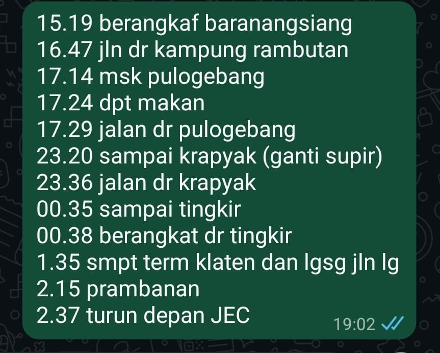Saya diam-diam sambil ngecek lagi app Cititrans. Kecanduan saya, duduk manis di bis mevvah, nyaman dan empuk tiba-tiba sampai tujuan. Ono rego ono rupo, tapi raono duite. Lho …. kok harganya turun lagi jadi 225k di H-1. Wah pelanggaran ini, saya jadi pingin naik bis.