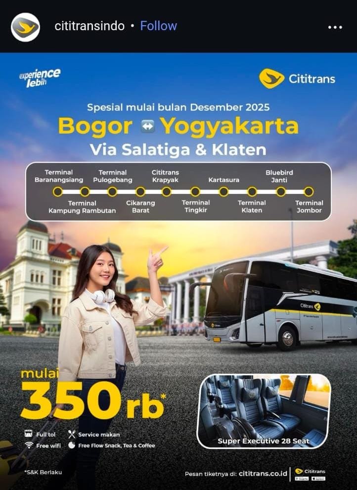 minggu 20des siang, saya tiba-tiba pingin ke jogja. karena kereta habis-habisan, ngecek bis. eh ternyata dari tanggal 3 desember 2025, cititrans (bis mevvah besutan bluebird group) buka jalur Bogor-Jogja. Bogornya di Terminal Baranangsiang lagi, ah pas sudah ga jauh dari rumah.
